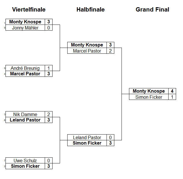 | 2. | Simon Ficker (Entscheidungframe gewonnen) | 2 | 1 | 0 | 9:3 |